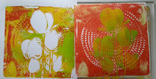 Op de 15x15 cm Gelli-plate gele, groene en turquoise acrylverf (bv ARA of Amsterdam) gedaan en uitgebrayerd.